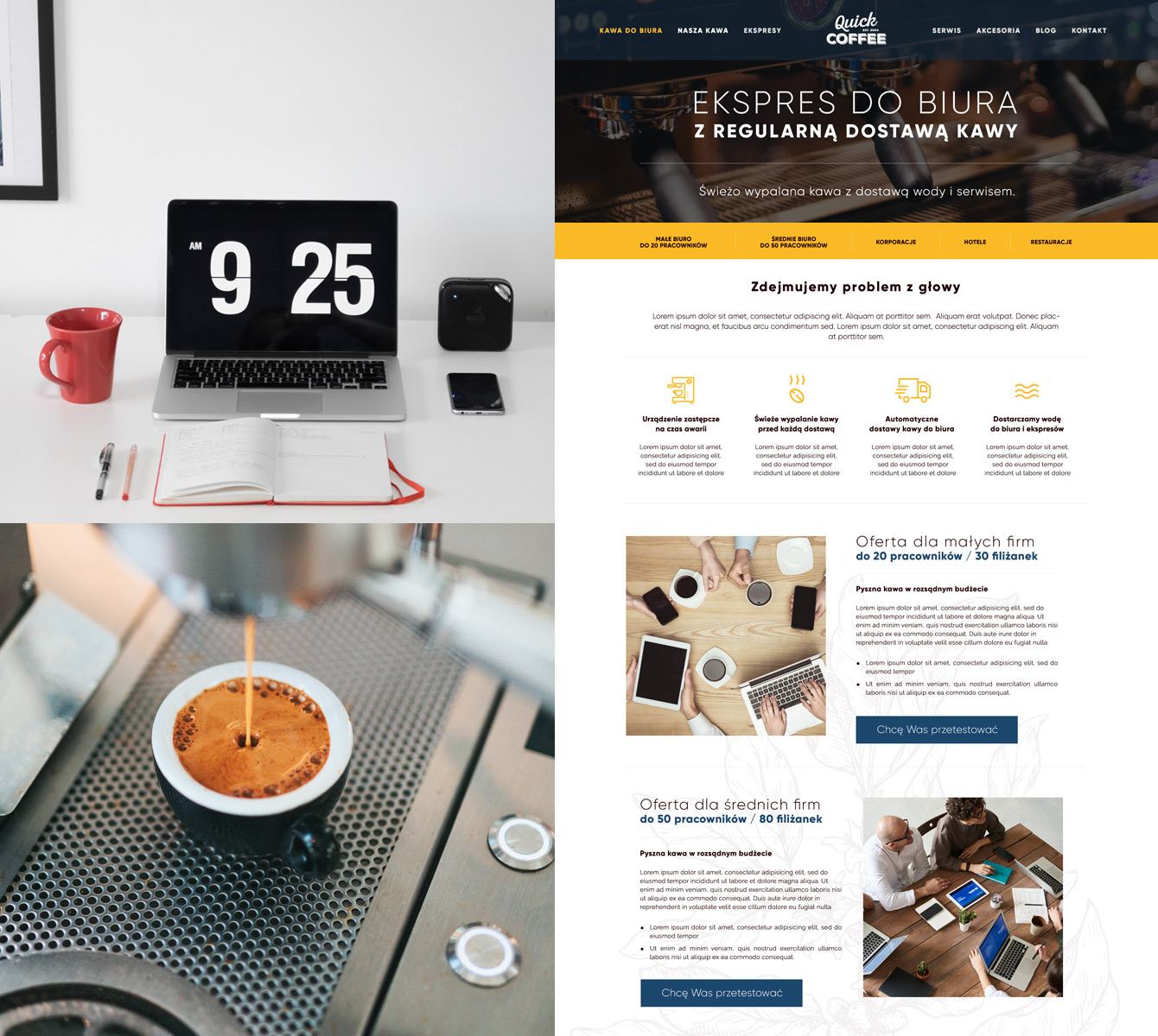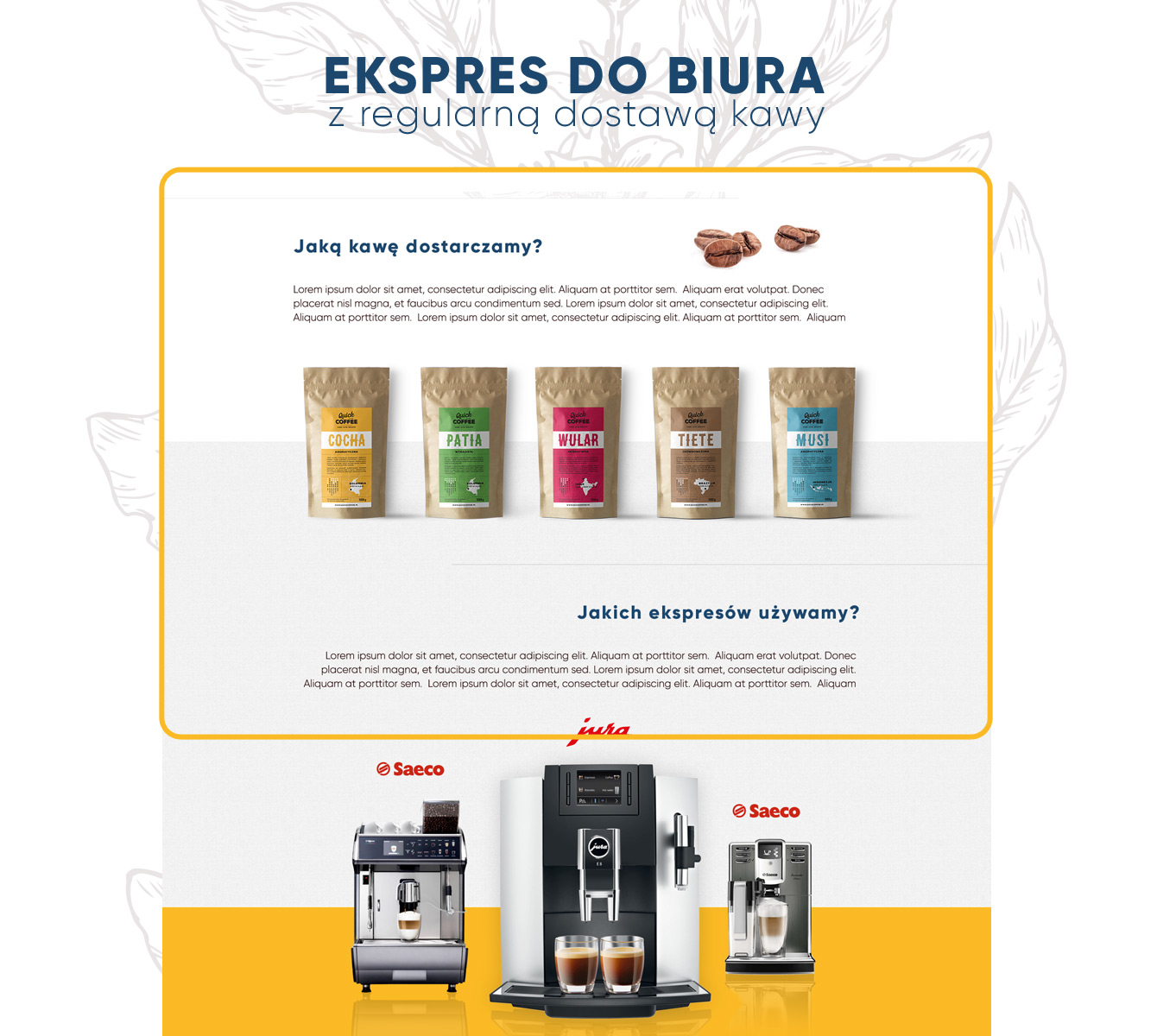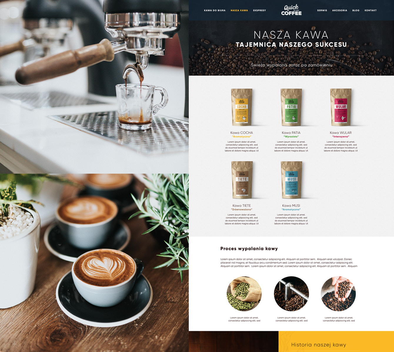 W mojej pracy dbam, aby Twoja strona lub strona Twojej firmy wyróżniła się na tle pozostałych swoją intuicyjnością, nieszablonowym projektem oraz trafnością zawartych na niej informacji. W tym stylu zaprojektowałam stronę dla firmy profesjonalnie zajmującej się tematem kawy oraz ekspresów do kawy.